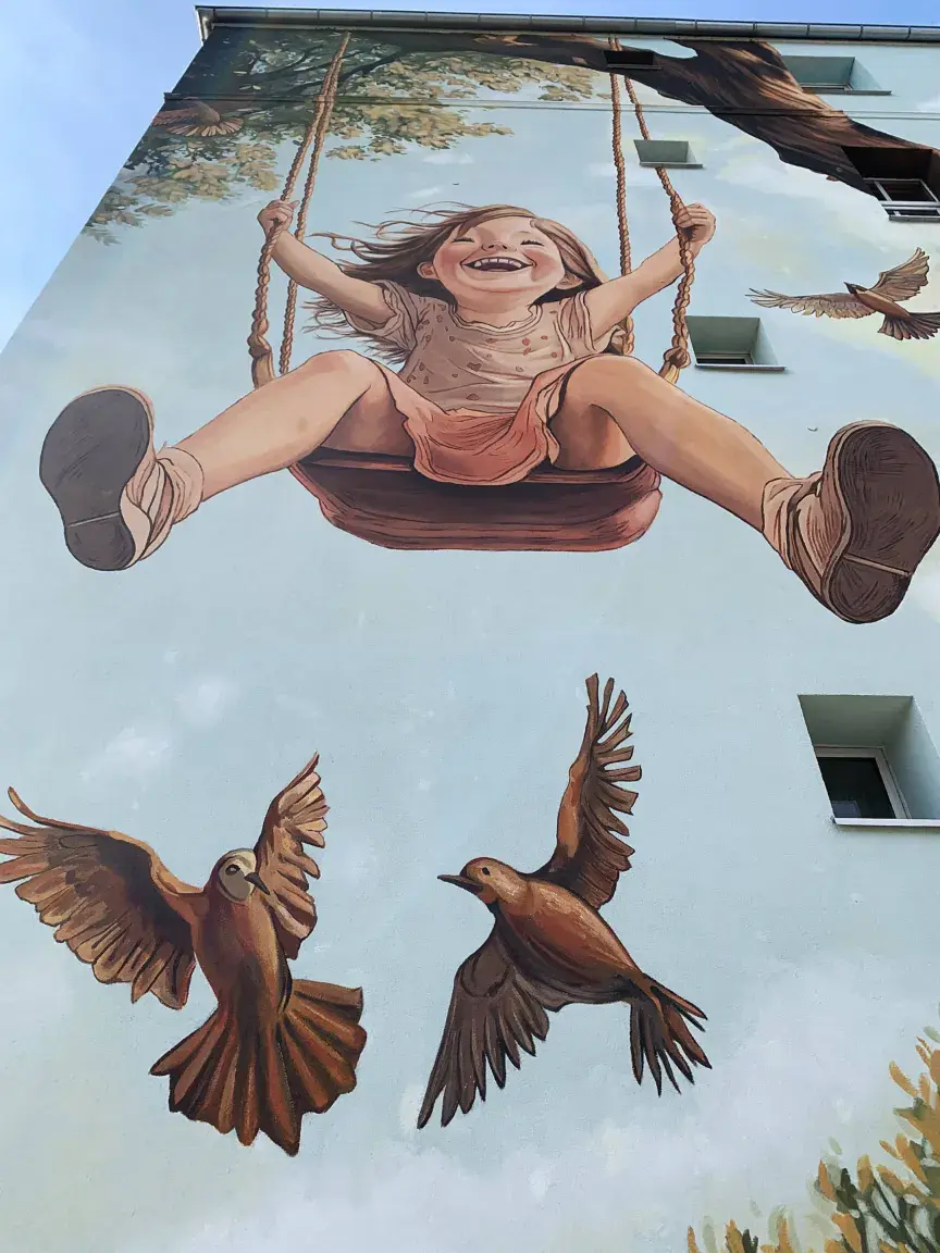 Malunek przedstawia roześmianą dziewczynkę bujającą się na huśtawce, przytwierdzonej do gałęzi drzewa, które też zostało przedstawione na muralu. Na malunku są też ptaki. Pracę wykonywały trzy osoby.