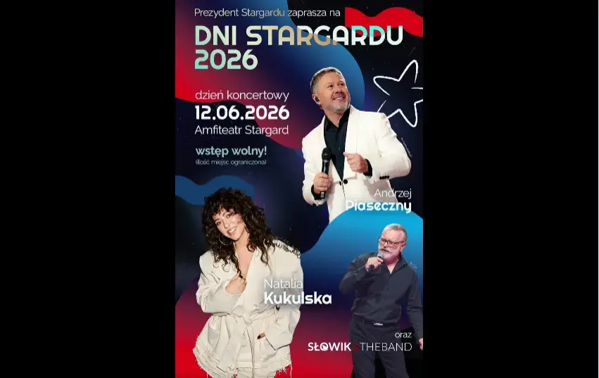 Stargardzkie Centrum Kultury, główny organizator muzycznego święta miasta, ogłosiło dziś gwiazdy Dni Stargardu 2026. W piątek 12 czerwca 2026 roku, na scenie stargardzkiego amfiteatru, zaśpiewać mają znani i lubiani wokaliści: Natalia Kukulska, Andrzej Piaseczny i stargardzianin Artur Słowik & The Band. Wstęp wolny.